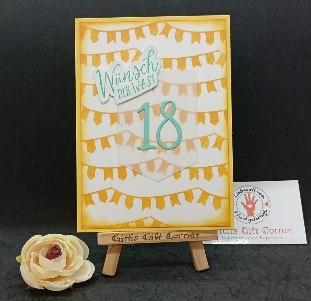 Gestempelt wurde in Osterglocke (147094) und Jade (147097) auf einem Stück grundweissen Farbkarton (159228). Der Aufleger wurde an den Seiten mit Osterglocke geinkt. Der Wimpel ist aus Vellum und die Zahlen wurden aus Jade (131302) ausgestanzt. Dazu kam dann noch ein Spruch, den ich mit Dimensionals (104430) aufgeklebt habe.