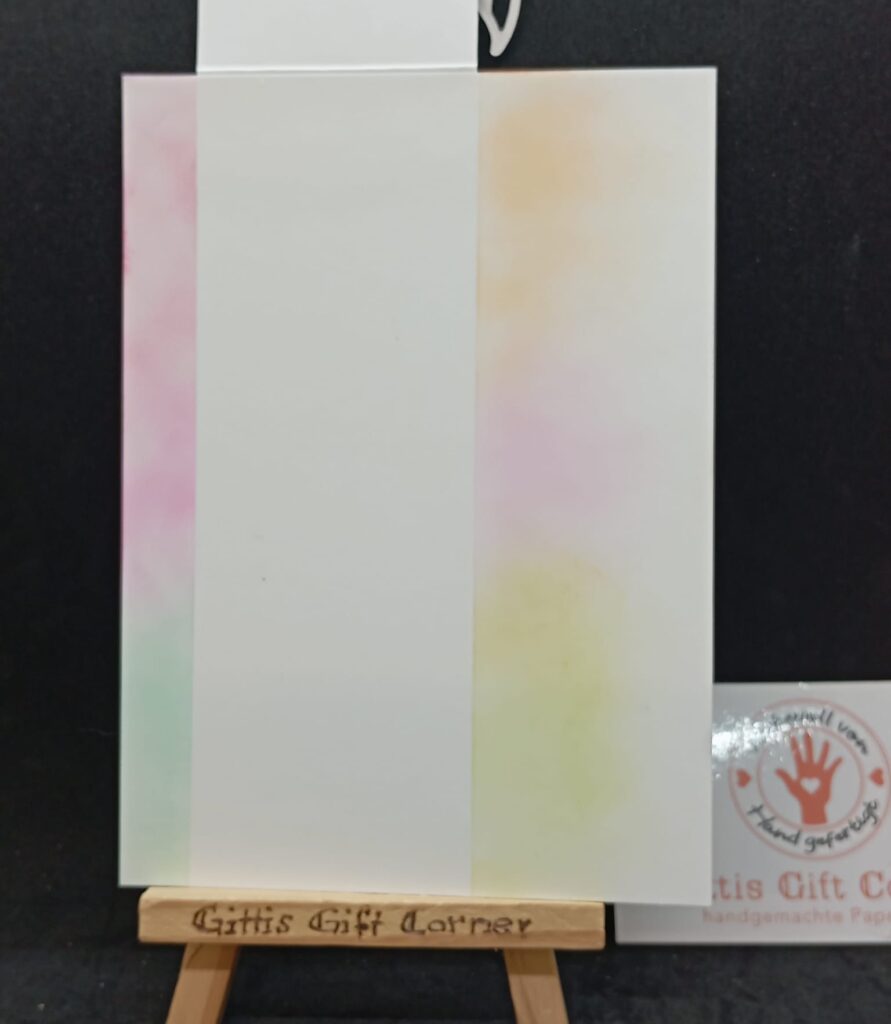 Den Streifen DSP habe ich auf einen minimal breiteren Streifen Grundweiß geklebt und dann mit einer Lasche auf dem Kartenrohling geklebt. Die Lasche befindet sich dabei auf der Rückseite des Rohlings. Damit diese verdeckt ist, habe ich quasi einen weiteren Rohling von hinten dagegen geklebt.