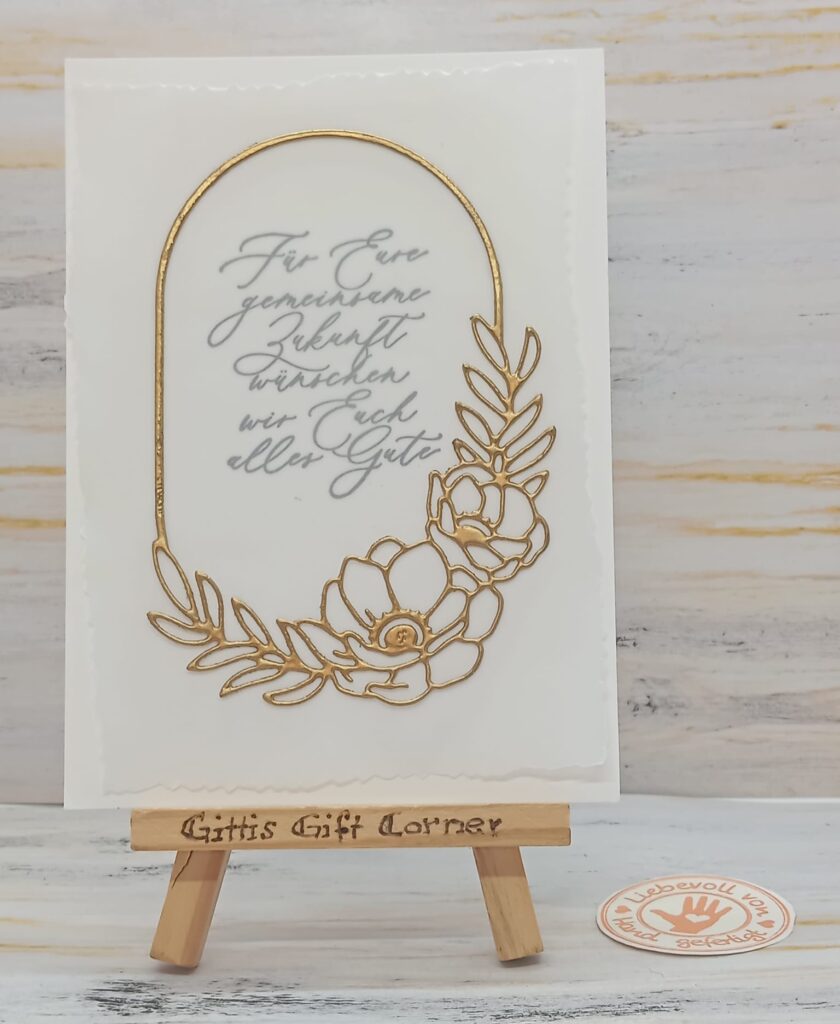 Auf den Aufleger kam ein Rahmen, gestanzt mit einer Stanzform aus dem dazu passenden Set „ewig verbunden“ (162583). Diesen Rahmen habe ich vorher ein paar Mal mit Versamark (102283) benetzt, mit Prägepulver gold (3er Set Metallfarben 165678) bestreut und anschließend heiß embosst. Wenn Du das öfter machst, dann bekommt das Stanzteil einen plastischen Effekt.
