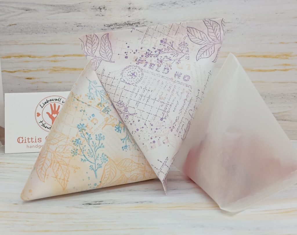 Dafür habe ich handelsübliches Kopierpapier in den Farben Babyrosa (161664) und Heideblüte (147103) sowie Pfirsich-Creme (163810) und Azurblau (161663) mit Stempeln aus dem Set Naturbotschaften bestempelt. Auf die Rückseite kam an die zwei langen und eine schmale Seite doppelseitiges Klebeband.
