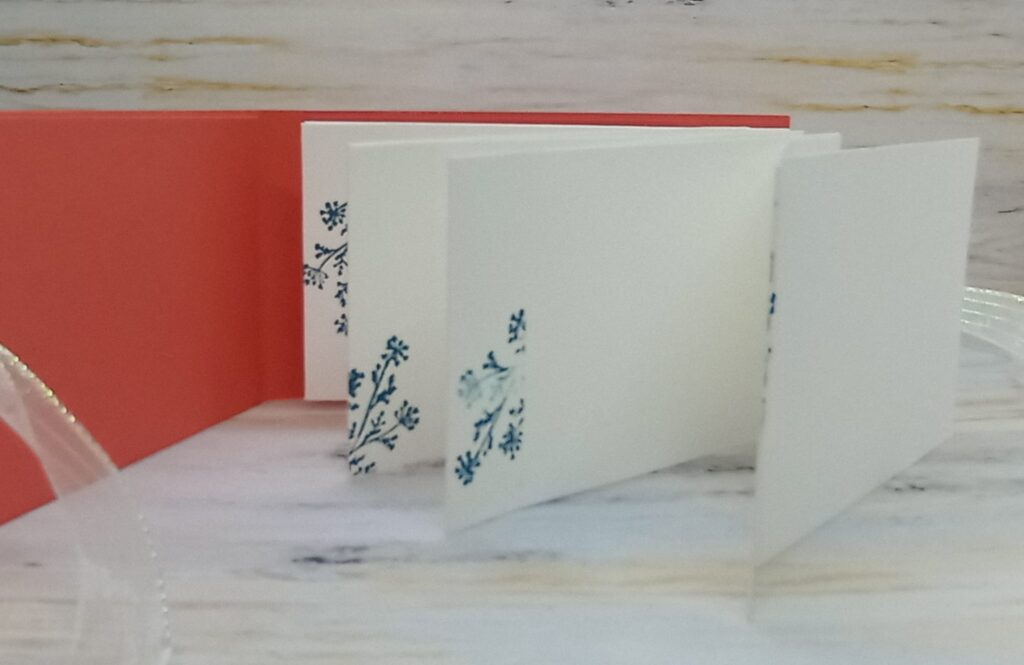 Die Fotoseiten bestehen aus 8 Stück grundweißen Farbkarton (159228), die einen knapp 2 cm breiten, bestempelten Rand haben. An diesem Rand, den ich in Pfauengrün (150083) mit einem Stempel aus dem Set Naturbotschaften verziert habe, habe ich die einzelnen Seiten mit einander verbunden. Der Clou daran ist, die Seiten nicht einfach hintereinander zu kleben sondern immer abwechselnd einmal an die linke und einmal an die rechte Kante. Dadurch entsteht eine fortlaufende Reihe, die sich über einander legen lässt.