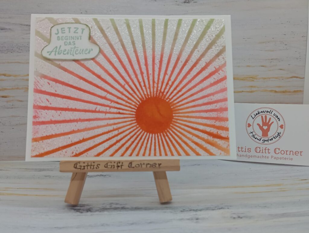 Durch den embossten Stempel bleibt die Karte an diesen Stellen weiß und erzeugt so ein wenig den Anschein von Sonnenstrahlen.