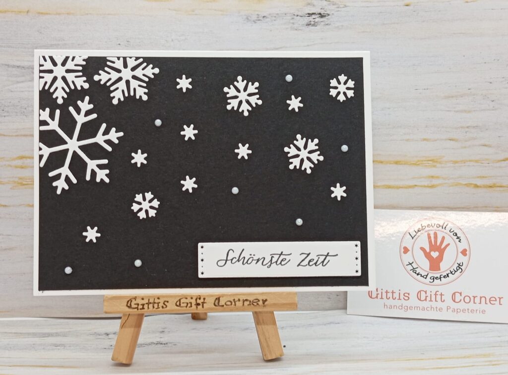 Nicht zu fassen oder, jetzt ist das Jahr schon zu 3/4 rum, in drei Wochen stellen wir die Uhr auf Winterzeit ein, Herbstanfang war schon, Winterreifen kann oder sollte man auch schon aufziehen und bei mir in der Gegend sind die Bergzipfel schon weiss gepudert. Wie traumhaft! (Wer die Ironie findet, darf sie behalten 🤣). Und da ich Schnee eigentlich nicht mag (merkt man wahrscheinlich gar nicht), habe ich versucht, ihn mir mit einer Karte schön zu basteln