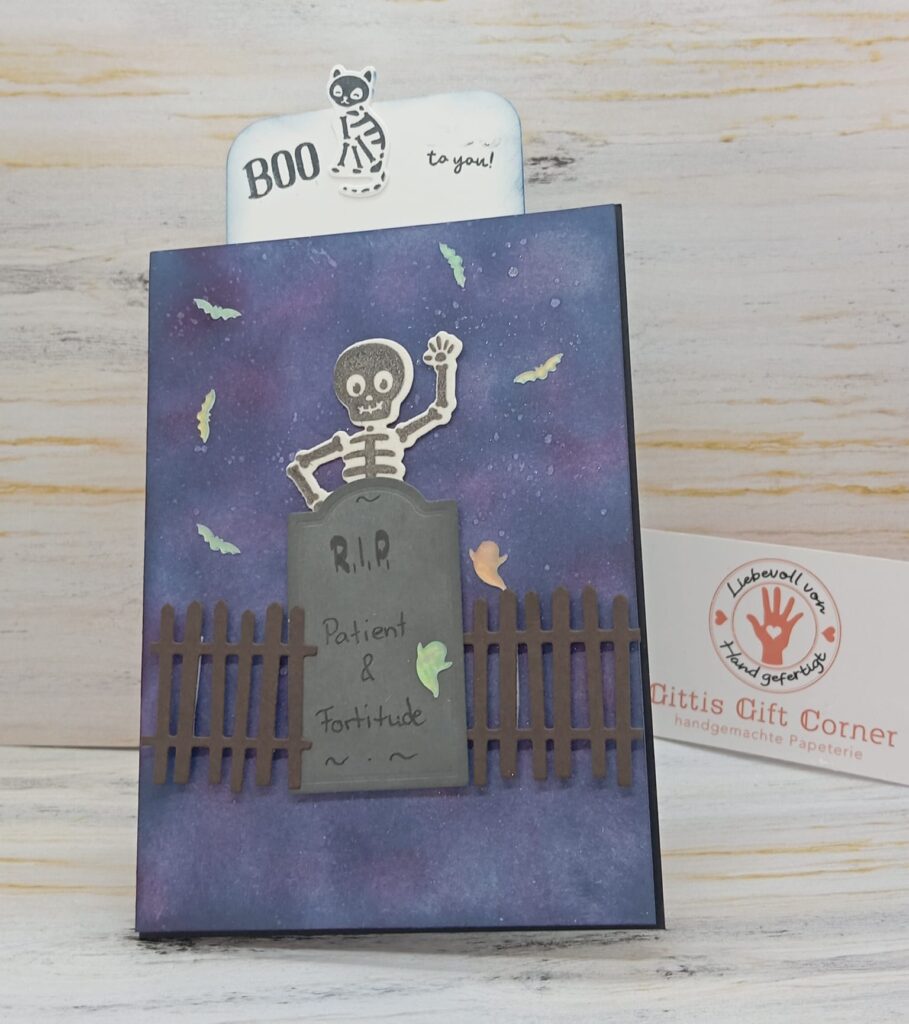 Das Skelett habe ich auf nachtleuchtenden Cardstock gestempelt und mit einem kleinen Schiebemechanismus durch den Schlitz auf einer dahinterliegenden Karte geklebt.