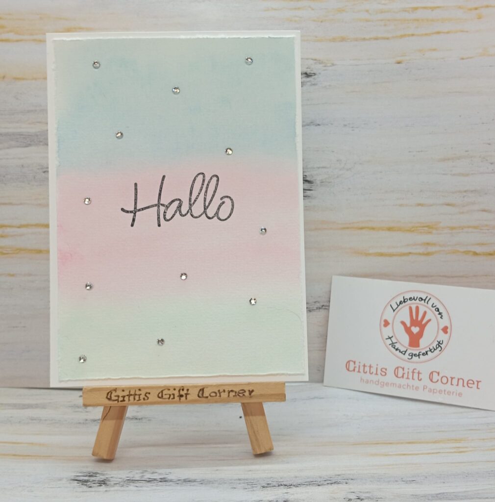 So ist mit wenig Aufwand eine wunderbare Karte entstanden und mal unters uns Bastelschwestern und -brüdern, „Hallo“ sagt man ja eigentlich viel zu selten